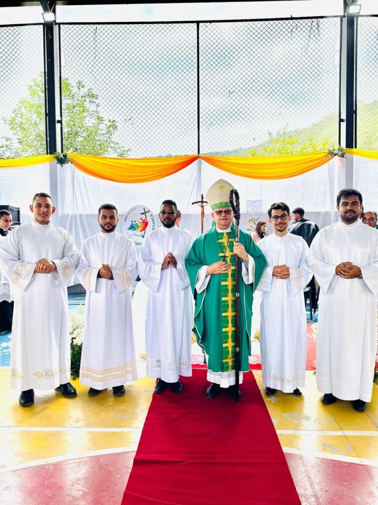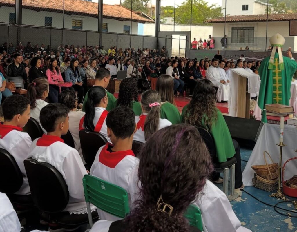 Após a acolhida e café, às 08h30 aconteceu a Celebração Eucarística presidida por Dom Geraldo Maia. Valorizando a importância dos diversos ministérios para a Igreja, conforme consta no Documento Final do Sínodo 2021-2024, os seminaristas Aleisson, Ângelo, Carlos, Gabriel e Francisco foram instituídos leitores, um importante passo na caminhada vocacional de cada um deles.